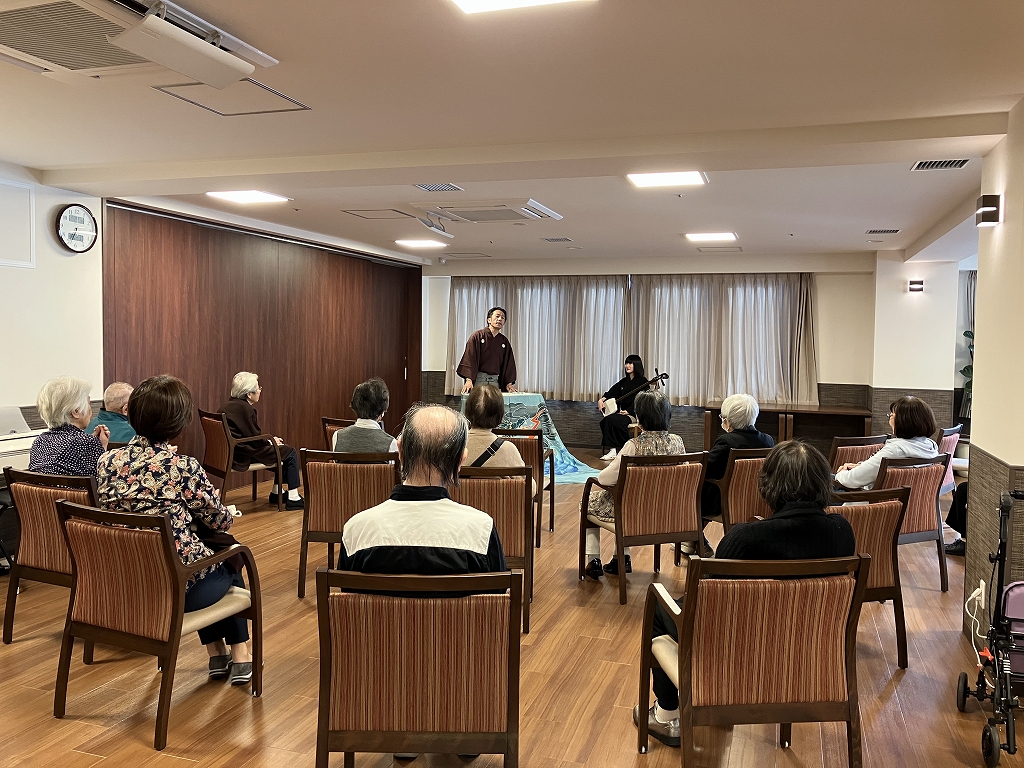 11月中旬には、リーフエスコート国立富士見台からの紹介を受け、浪曲師の三門 綾(みかど りょう)様と曲師の広沢 美舟(ひろさわ みふね)様をお招きして「浪曲の会」を開催いたしました。